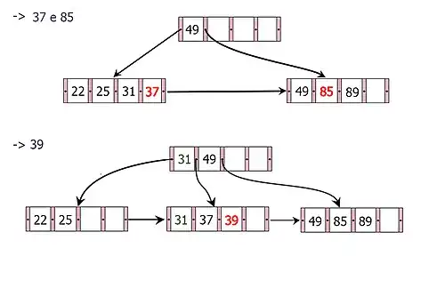 - caso ocorra divisão da página, a chave deve ser mantida na folha e copiada para cima (divide se a página ao meio e sobe o menor valor criado da nova página da direita)