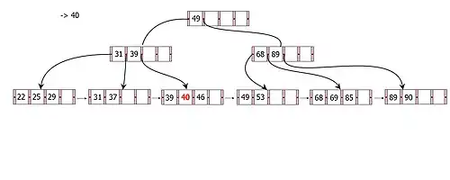 A Árvore B+[1] é uma estrutura de dados em que todas as chaves estão armazenadas nas folhas. Cada folha aponta para a próxima folha, o que permite uma facilidade na leitura sequencial. Sua estrutura se assemelha bastante com a Árvore B possuindo as mesmas características de ocupação da árvore, níveis das folhas e números de filhos.