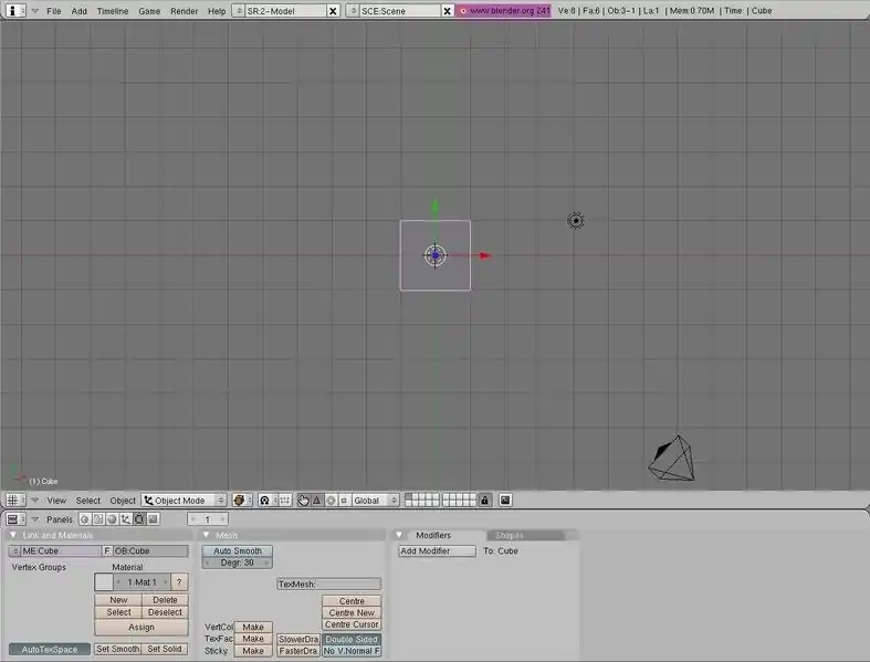 Agora nós vamos adicionar um objeto Mesh (uma malha é a base para muitos modelos 3D). Supondo que você esteja modelando um personagem, seria útil criar apenas um lado, e automaticamente criar o outro lado. Para fazer isso, nós vamos espelhar a malha (mesh):