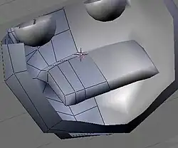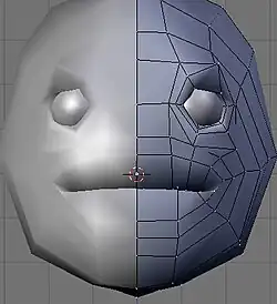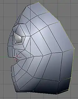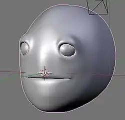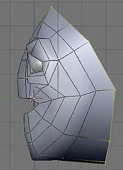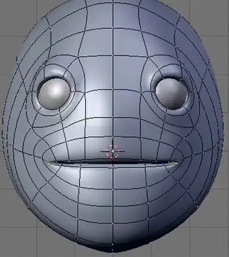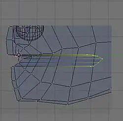- Desligue o Subsurf na Edit Mode, usando os botões do modificador. Agora nós podemos ver a jaula de edição subjacente. Note que o lábio superior da jaula de edição parece estar sobrepondo o lábio inferior. Você pode mesmo ver algumas das vértices do lábio inferior, porque elas estão cobertas pelo lábio superior.