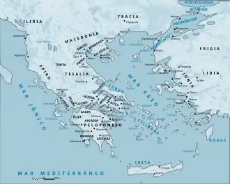 Ao norte do golfo de Corinto fica a chamada Grécia continental e ao sul fica a Grécia peninsular. A Grécia insular, é como diz o nome formada pelas ilhas do mar Egeu. Grécia continental, montanhosa, difícil cultivo. Grécia peninsular, litoral fácil de navegar. Grécia insular, muitas ilhas, fácil de navegar de uma para outra.
