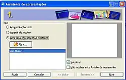 Na sequência aparecerá uma tela principal do Assistente do BROffice.org vrs Impress que permitirá que o usuário crie uma apresentação vazia ou com uma formatação pré-existente (a partir de um modelo) ou que o usuário abra uma apresentação já existente.