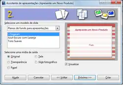 Apresentação a partir do modelo: disponibiliza as opções Apresentar um novo Produto ou Recomendar uma estratégia. Através do Assitente o usuário poderá criar a apresentação passo-a-passo e fornecer dados para a confeccção da apresentação e com todas as informações montará um layout.