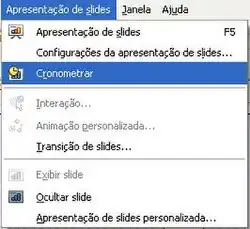 Cronometrar. O BrOffice.org iniciará a apresentação exibindo no canto inferior esquerdo um cronômetro, de modo que o usuário poderá pressionar a tecla Enter entre a exibição de um slide e outro, simulando o intervalo mais adequado para uma apresentação automática.