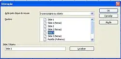 Definir como objeto selecionado deverá se comportar ao clicar nele durante uma apresentação, ou seja, consiste em atribuir uma ação pré-definida como: ir para o próximo slide, um slide específico, abrir um outro documento ou executar outra ação da lista.