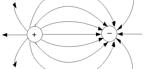 Visto isto, como ficariam as linhas de força do nosso Dipolo Elétrico estudado no item anterior? Como as cargas positivas e negativas se atraem, as linhas de força que "saem" da carga positiva encontram-se com as linhas que "entram" na carga negativa. Esquematicamente seria como a figura abaixo: