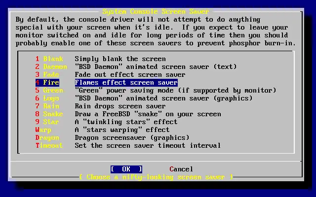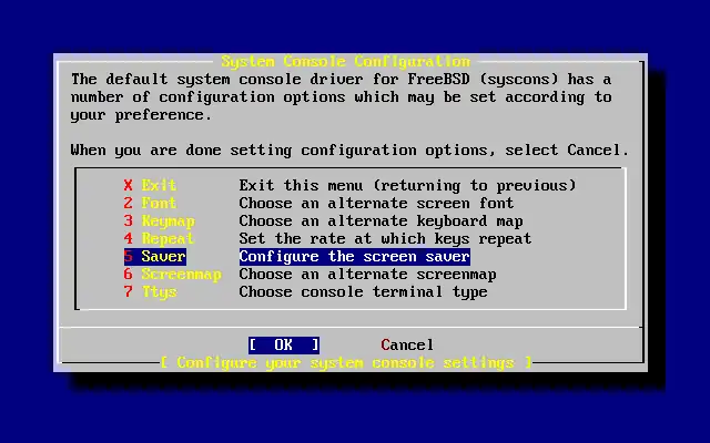 Escolha o protetor de tela desejado usando as setas e aperte Enter. O menu de configuração do console do sistema irá ressurgir.