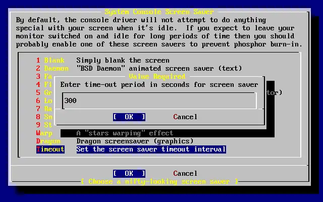 O intervalo temporal padrão é 300 segundos. Para modifica-lo selecione Saver novamente. No menu de opções do protetor de tela selecione Timeout e aperte Enter. Um menu irá surgir:
