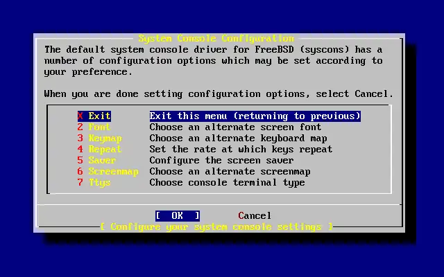Após a instalação bem sucedida do sistema operacional, é iniciada a configuração de uma série de opções. Cada opção pode ser configurada revisitando as opções de configuração antes de iniciar o recém instalado sistema FreeBSD ou, no sistema já instalado, chamando o comando /stand/sysinstall e selecionando a guia Configure.