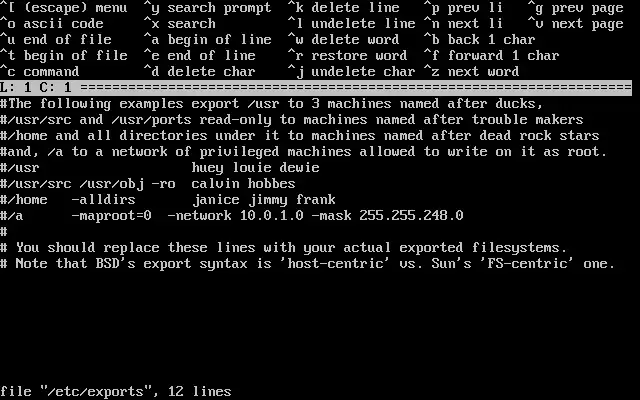 Aperte Enter para continuar. Um editor de texto será iniciado, permitindo a criação do arquivo exports bem como sua edição.