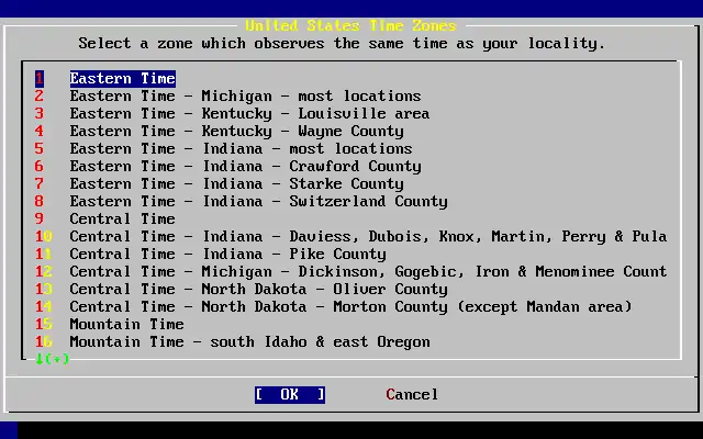 O fuso horário apropriado é selecionado com as setas do teclado e apertando Enter.