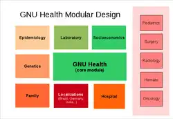 - Módulo: Módulos são programas que fornecem funcionalidades específicas. GNU Health fornece módulos diferentes para atender às suas necessidades de centros de saúde. Exemplo de módulos são Socioeconômicos, Genética e Cirurgia. Você só deve instalar os módulos que são realmente necessários para o seu centro.