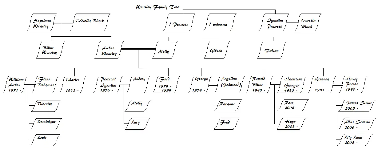 Arthur Weasley e Molly Weasley tem seis filhos e uma filha, Bill, Charlie, Percy, os gêmeos idênticos Fred e George, Ron e Ginny.