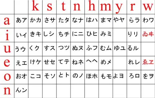 A primeira palavra do quadro está escrita como Hiragana, e a segunda como Katakana. Para formar a palavra, utilize primeiramente a letra da linha superior seguido pela letra da primeira coluna.