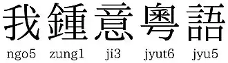 Todas as línguas siníticas (relacionadas à China) e dialetos, incluindo cantonês são escritas em Hànzì (Mandarim)/Honji (Cantonês), um sistema de escrita imagem. Assim mesmo, muitos estudantes de fala inglesa aprendem a pronunciar o cantonês usando o sistema de romanização. usualmente usando Romanização Yale ou Jyutping. Veja abaixo alguns exemplos: