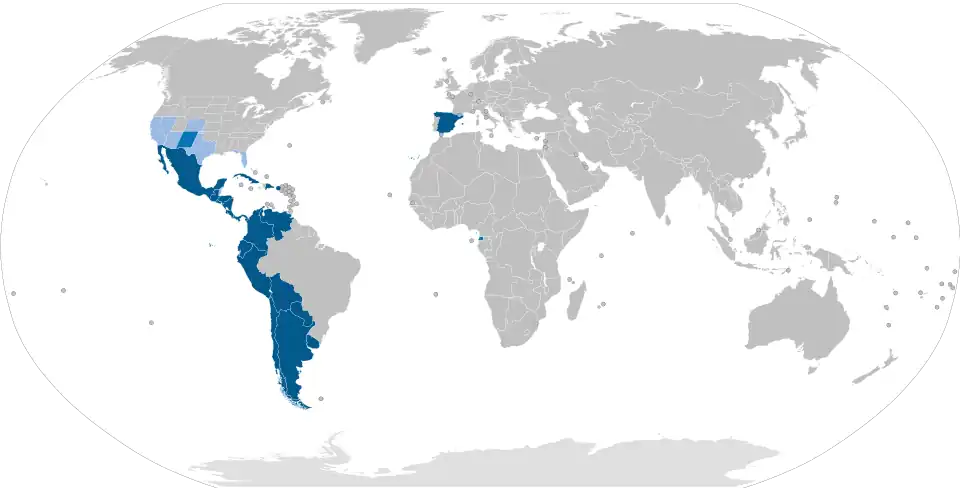 A língua espanhola é falada nas Américas Central e do Sul (exceto no Brasil, na Guiana, Guiana Francesa e Suriname), na América do Norte (México) e na Europa (Espanha). Um grande número de falantes de espanhol também vive nos Estados Unidos e a língua também é falada em várias ilhas do Caribe incluindo República Dominicana, Cuba e Porto Rico. Alguns judeus que vivem em Israel falam um dialeto chamado Sefardi, também chamado Ladino. Os maiores países falantes de espanhol são México, Colombia, Espanha, Argentina e Estados Unidos.