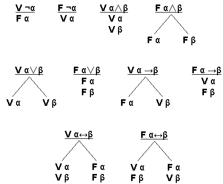 Contudo, digamos que nosso interesse seja apenas determinar se uma fórmula é tautológica ou um argumento é válido. Caso a fórmula ou o argumento seja complexo, poderíamos demorar muito até terminar a tabela, ou, no caso de ser uma contingência ou um argumento inválido, encontrar a valoração na qual a fórmula é falsa, ou a premissa seja verdadeira enquanto a conclusão é falsa, respectivamente.