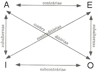 - Exemplo: Dadas as proposições "Todo corvo é preto" (A), "Nenhum corvo é preto" (E), "Algum(ns) corvo(s) é(são) preto(s)" (I), "Algum(ns) corvo(s) não é(são) preto(s)" (O), o valor (verdadeiro ou falso) de qualquer uma determina o valor das demais dentro do mesmo contexto.