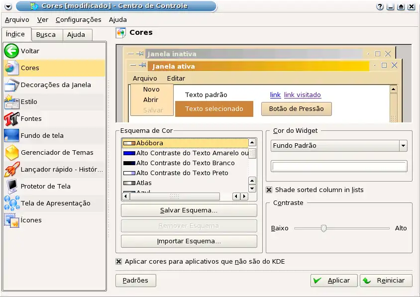 - Aqui você define a cor de cada elemento do ambiente(Painéis, barras de título, fundos, etc). É possível arrastar as cores da janela de cores para os elementos da miniatura. Existem já dezenas de esquemas de cores prontos e você pode criar um novo que mais lhe apraz. Também é possível baixar do site kde-look esquemas prontos de cores ou até submeter o seu! Clique na barra lateral em "Color Schemes", escolha, você pode ver ordenando pelos mais novos, pelos mais baixados, mais populares, etc. Escolha o seu, clique nele e clique em [download]. O Browser vai pedir onde você quer salvar o arquivo .krsc. Salve por exemplo, no seu home(~):/home/seu nome, que deve ser a provável sugestão. Apenas clique então em "Importar Esquema..." na janela do Centro de Controle-Cores e pronto! Seu tema foi instalado e está pronto pra usar!