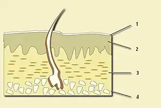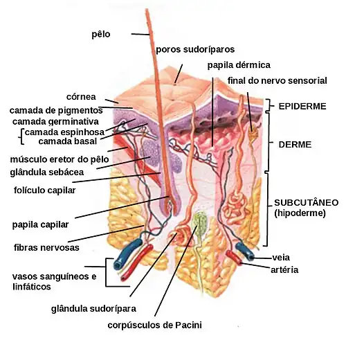 A epiderme é constituída por epitélio de descamação estratificado dividido em cinco camadas.