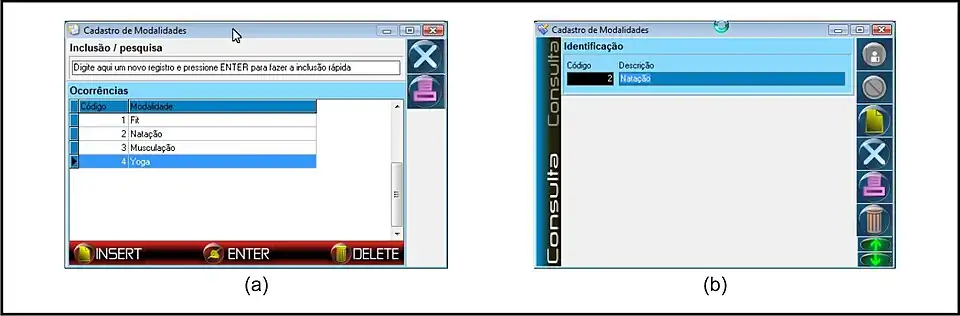 (a) Tela de listagem de dados. Nesta tela é exibida a lista das modalidades que foram previamente cadastradas. Para editar os dados cadastrados selecione o nome da modalidade na tabela de dados, pressione ENTER ou dê um clique duplo sobre a mesma. Para excluir selecione a modalidade na tabela e pressione DELETE, porém caso a modalidade já esteja sendo utilizada em alguma avaliação ela não poderá ser excluída, apenas poderá ser editada. (b) Tela de detalhamento de dados. Esta tela tem os mesmos recursos, básicos, presentes em todas as telas desse tipo.