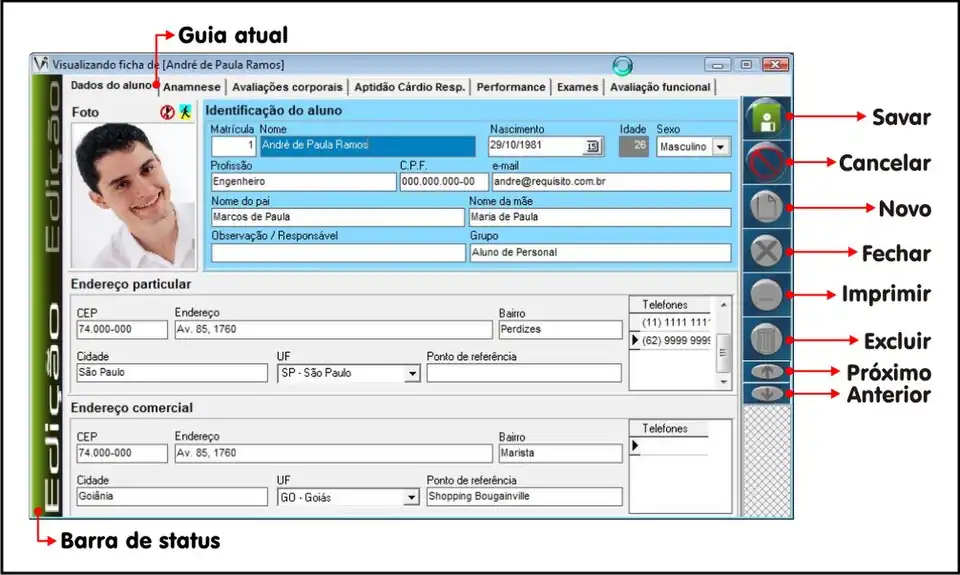 Exemplo de tela de “Detalhamento de dados”. Todos os cadastros contam com uma tela de detalhamento de dados, onde a interface básica é a mesma. Os componentes que estão presentes em todas as telas desse tipo são a barra de status e os botões de salvar, cancelar, novo, fecha, imprimir, excluir, registro anterior e posterior. Em alguns cadastros também existem guias utilizadas para organizar as informações por afinidade e para acessar o seu conteúdo é preciso clicar na guia.