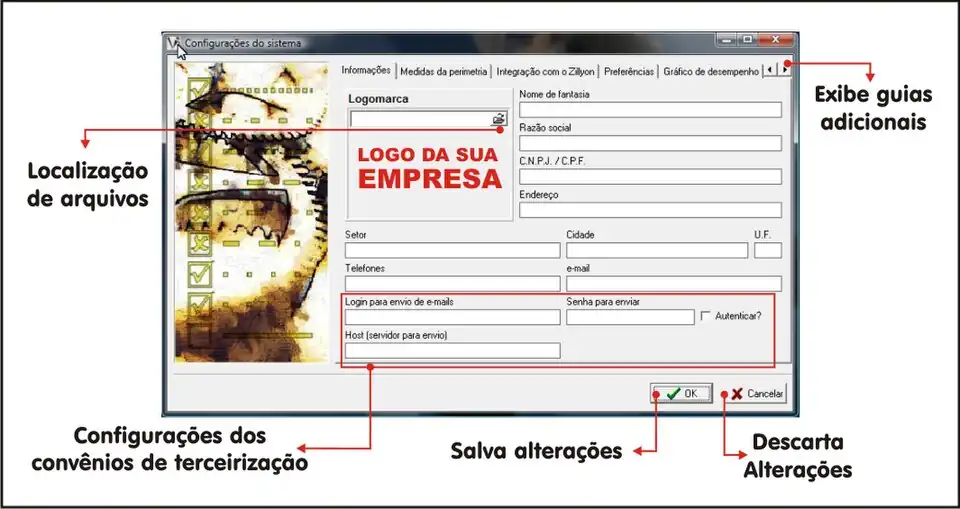 Esta é a primeira aba, a de informações gerais da empresa e/ou profissional liberal. Nesta, os dados comerciais devem ser informados, assim como a logomarca da empresa e/ou do profissional para que os mesmos possam ser impressos nos laudos emitidos pelo sistema. Também é possível configurar os Convênios de Terceirização, que permite que empresas prestadoras de serviços de avaliação física possam enviar para as empresas contratantes as avaliações realizadas, tudo pela Internet.
