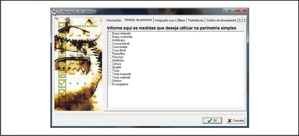 O sistema somente irá exibir durante a avaliação física, caso o avaliador selecione a perimetria simplifica, os parâmetros que forem marcados aqui. Esse recurso torna possível a personalização do sistema quanto às medidas dos perímetros de maior relevância, levando-se em consideração as preferências do avaliador e as características do público alvo. A seleção dos perímetros da perimetria simplificada é realizada clicando na caixa de seleção presente na frente do nome de cada parâmetro.