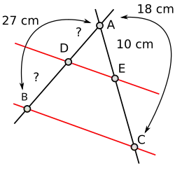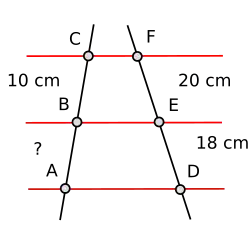 ![]() Pelo teorema de Tales, tem-se a igualdade que neste caso corresponde a ou seja, Multiplicando-se ambos os membros por 26, resulta que Portanto, o lado mede 16 cm. Além disso, tem-se isto é, Consequentemente, Então, o lado mede 10 cm neste caso. |