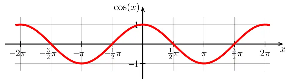 Esta é uma função par, pois cos (-x) = cos x, qualquer que seja x pertencente ao conjunto dos números reais. Igual à função seno, a função cosseno tem período igual a 2π e amplitude igual a 1. O gráfico da função cosseno forma uma cossenoide. De forma similar à função seno, podemos transformar qualquer ângulo real para 0° < x ≤ 90° e assim obter seu cosseno:
