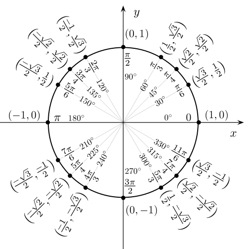 Colocando os ângulos notáveis neste círculo obtêm-se os valores (x; y) em que x é o cosseno do ângulo e y o seno: