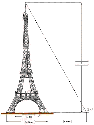 Um turista com um teodolito, situado a 120 metros da base da Torre Eiffel, mede o ângulo entre a horizontal e o topo da antena no alto da torre. Ele acha 60,6°.