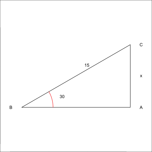 Na figura ao lado, determine o valor de x (cateto AC) dado que a hipotenusa BC vale 15 cm e o ângulo B vale 30 graus.