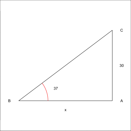Na figura ao lado, determine o valor de x (cateto AB) dado que o cateto AC vale 30 cm e o ângulo B vale 37 graus. Considere que sen(37 graus) = 0,6 e cos(37 graus) = 0,8.