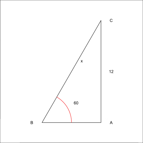 Na figura ao lado, determine o valor de x (hipotenusa BC) dado que o cateto AC vale 12 cm e o ângulo B vale 60 graus.