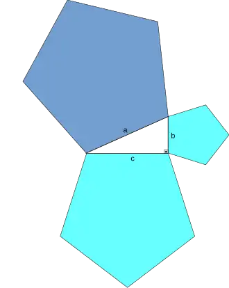 Sejam , e as áreas dos polígonos regulares construídos sobre os lados do triângulo retângulo. Assim, temos que , e , onde , e são, respectivamente, as áreas de dos triângulo em que foram decompostos cada um dos polígonos regulares construídos sobre a hipotenusa e os catetos do triângulo ABC.