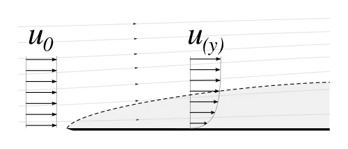 A linha tracejada na figura indica a região conhecida como camada limite (ing. boundary layer). Nessa região, o fluxo sofre o efeito da viscosidade do fluido. Fora dessa região, o fluido ainda não teve sua velocidade alterada pelo ingresso no tubo, ou seja, u = u0. Assim, podemos dizer que o escoamento já está plenamente desenvolvido para valores de x onde a camada limite ocupa todo o tubo. O valor de x no qual isso ocorre é chamado de comprimento de entrada.