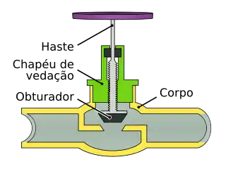 Nas válvulas globo, o bojo é construído de forma a mudar a direção de escoamento em 90° e fazê-lo passar por um orifício circular. Em volta desse orifício é colocado um anel (ou gaxeta) de vedação. O obturador é um plug terminado em um disco, que é fixado a uma haste e se move para dentro e para fora do bojo, encaixando-se sobre o anel de vedação quando totalmente imerso. Após atravessar o orifício, o fluxo retorna à direção de escoamento original.