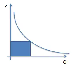A imagem de cima representa uma curva da procura. É senso comum (e a curva mostra precisamente isso) que se subirmos o preço a quantidade procurada diminui, e se baixarmos o preço a quantidade procurada aumenta. O ponto de equilíbrio será determinado a partir da intersecção com a curva da Oferta (algo que será analisado no capítulo 3). Neste caso, partindo que o equilíbrio é o representado no gráfico, a despesa do consumidor é representada pela área a azul.