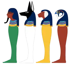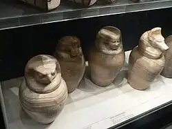 Eram quatro vasos especiais que guardavam os órgãos internos da múmia (fígado, pulmões, estômago e intestinos), cada vaso tinha uma tampa em forma de cabeça, de homem, de falcão, de babuíno e de chacal.