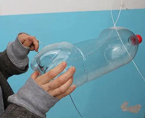 6. Atravesse as extremidades da garrafa perfurada com os fios de arame.