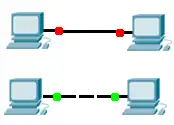 A única diferença entre esses dois cabos é a disposição dos pinos internos. Um exemplo pode ser visto no próprio programa. O cabo cross-over possibilita ligar um computador direto no outro (mostrado como duas bolas verdes) enquanto o cabo par-a-par mostra haver erro na ligação.