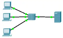 Agora vamos criar os computadores. Será demostrado a compatibilidade entre os protocolos ethernet, Fast ethernet e gigabit ethernet|Gigabit ethernet. Crie 3 computadores que por padrão tem conexão Fast Ethernet e conecte ao hub através do cabo par-a-par(Straight-Through), cada um aos 3 tipos de protocolos. Veja que depois de um tempo, a luz ficará verde indicando o funcionamento correto. Crie mais dois computadores, agora com um conector Ethernet e outro com Fast Ethernet e conecte cada um ao protocolo oposto (Giga em Ethernet). Uma porta fast ethernet ficará livre como porta de saída. Veja a completa compatibilidade entre cada tipo de conexão.