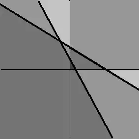 As linhas mais finas representam o eixo X e Y, os quais representam respectivamente o número de mesas (M) e cadeiras (C). Todos os pontos dentro ou abaixo àquela reta grossa mais inclinada representam pontos que satisfazem a Restrição 2. Todos os pontos dentro ou abaixo àquela reta grossa menos inclinada satisfazem a Restrição 1. Pontos à direita da reta Y e acima do eixo X satisfazem a exigência de que não podemos fabricar um número negativo de objetos. Quanto mais restrições um ponto no gráfico acima satisfaz, mais escuro ele aparece. A única região onde todas as restrições são satisfeitas é aquele triângulo escuro localizado próximo ao centro do gráfico. Os vértices do triângulo são os pontos (0,0), (0,10) e (5,0).