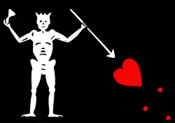 A sua bandeira simboliza o diabo com um arpão na mão esquerda apontando para o coração, enquanto segura uma ampulheta com a mão direita. Esses fatores indicavam ao capitão que seria abordado,que o tempo acabou e que se não quisessem morrer que se entreguem.