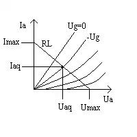Imax e Umax refletem o que acontece ao carregar o tubo. Você tem uma voltagem máxima, Umax, que você planeja colocar no tubo. Mas você entende que precisa colocá-lo por meio de uma resistência anódica (a resistência do catodo é tão pequena que negligenciamos isso). Então a linha de carga chamada RL na figura mostra como o tubo irá funcionar. A corrente máxima, Imax, nunca será alcançada e é igual a Umax, dividida pela resistência do ânodo, neste caso chamada RL.