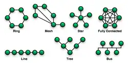 - Redes em Barramento: Nesta rede, existe um barramento por onde toda a informação passa e toda vez que alguém coloca uma informação no barramento, as máquinas conectadas a ele recebem a mensagem. Um exemplo é a última rede mostrada no desenho acima.