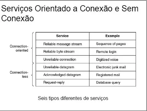 Os serviços podem ser orientados a conexão ou não. Serviços relacionados à família TCP são orientados a conexão, enquanto serviços relacionados ao protocolo UDP são sem conexão.