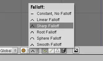 - Uma vez que você ativou o modo de edição proporcional, outro botão aparece à sua direita, o botão falloff. Selecione Smooth Falloff. Alternativamente, você pode usar o menu no cabeçalho da janela 3D (Mesh → Proporcional Falloff → Smooth) ou, usando SHIFT+O irá alternar entre Sharp Falloff e Smooth Falloff (em versões anteriores à de 2,37) ou percorrer todas os 6 tipos de Falloff (nas versões 2.37 e acima), enquanto utilizar a ferramenta de edição Proporcional.