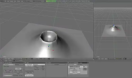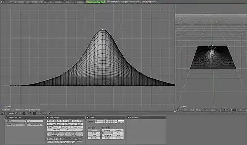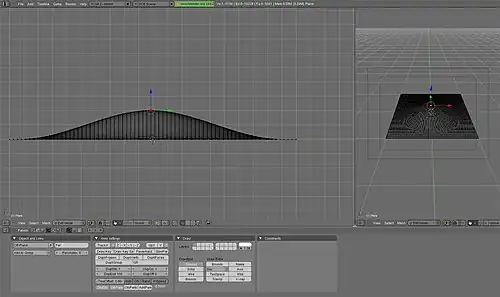 Com a vista superior ativa, selecione um dos pontos no meio do plano. Com este ponto selecionado mude para a vista lateral. E agora começa a diversão. Pressione O. (Você deve ver, agora, um pequeno ponto amarelo no menu do painel da 3D View.) Ele permite acesso à edição da ferramenta proportional falloff. Se você mover um vértice enquanto este estiver selecionado todos os vértices em um determinado raio serão influenciados pelo mesmo movimento. E a proporção desta influência pode ser escolhida na aba à direita do ponto amarelo. Proponho usar o smooth falloff .